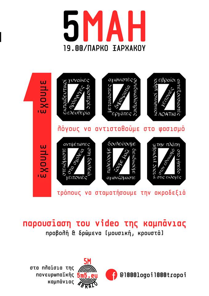 Τα δημοτικά σχήματα «Η Πόλη Ανάποδα» και «Δύναμη Ανατροπής» στηρίζουν για όλους τους λόγους του κόσμου την πανευρωπαϊκή αντιφασιστική καμπάνια «5Μ», που κορυφώνεται στις 5 Μαΐου 2019, με δράσεις σε κάθε χώρα της Ευρώπης. Στη Θεσσαλονίκη, η πρωτοβουλία «Για Χίλιους Λόγους, με Χίλιους Τρόπους» διοργανώνει την Κυριακή 5 Μαΐου, στις 19.00 στο Πάρκο Ξαρχάκου, προβολή βίντεο και μουσικά δρώμενα για να διατρανώσει την πάλη ενάντια στον φασισμό και το σκοτάδι.