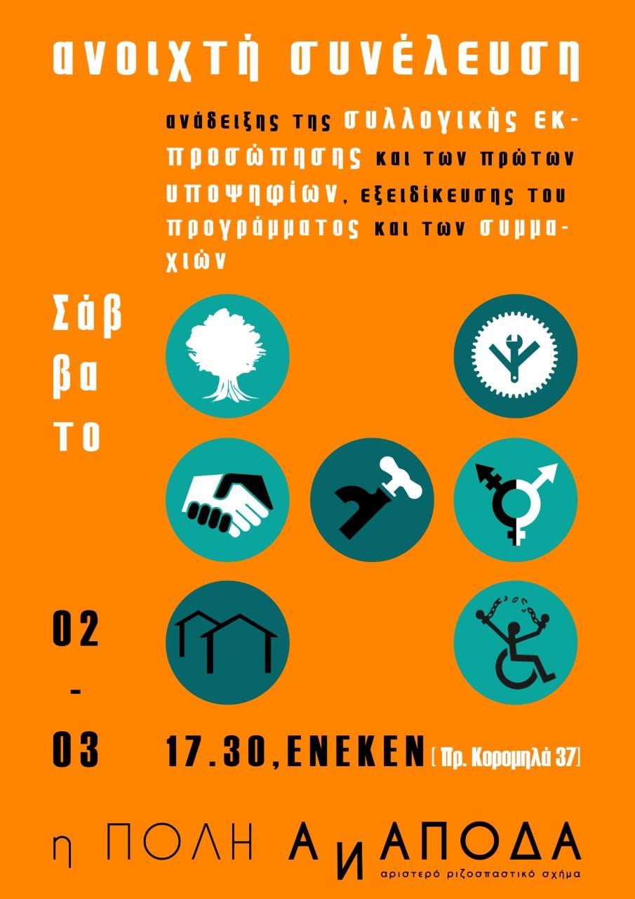 Μετά την ιδρυτική μας συνέλευση (2/2) όπου ψηφίστηκαν οι βασικές γραμμές του προγράμματος, σε αυτή την δεύτερη συνέλευση εξειδικεύουμε παραπάνω το πρόγραμμά μας μετά και από κάποιες συναντήσεις με κινήματα της πόλης. Επίσης θα συζητήσουμε για την συλλογική εκπροσώπηση και κάποιους υποψήφιους. Τέλος θα συζητήσουμε και για την δυνατότητα συμμαχιών με άλλες αριστερές δυνάμεις!